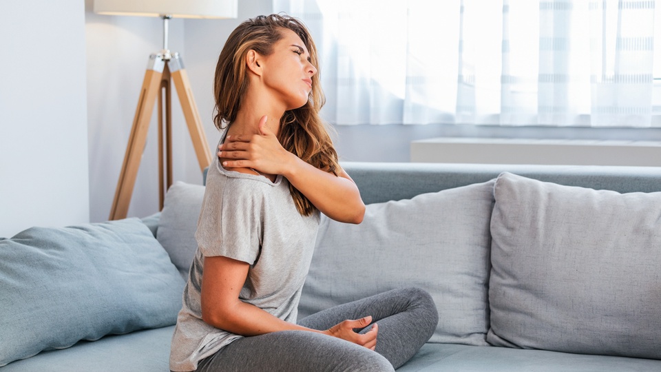Die häufig beklagten Muskelverspannunge und die Schmerzen im Nacken- und Schulterbereich entstehen wegen einer Überlastung der Halswirbelsäule durch den nach vorne geneigten Kopf.